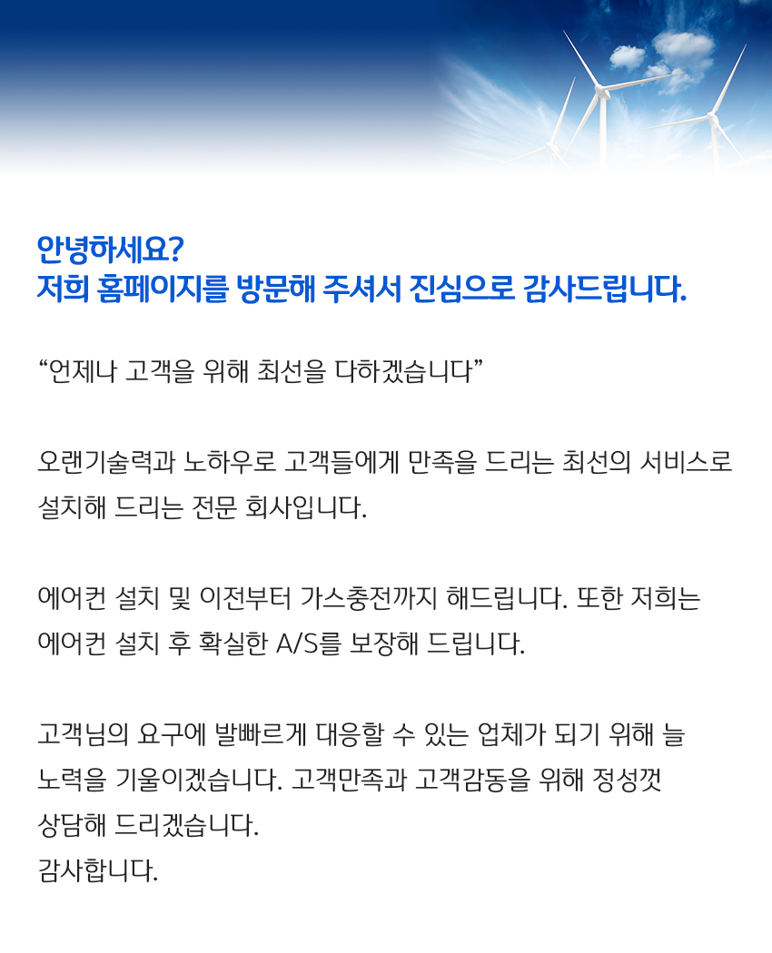 종합에어컨 홈페이지에 방문해주셔서 감사합니다.저희 종합에어컨은 구미시/김천시/외관 등의 지역에서 에어컨이전설치,냉난방기 에어컨 a/s를 전문으로 하고 있습니다. 저희 종합에어컨은 언제나 고객만족을 위해 노력합니다. 저희업체는 늘 고객님과 더불어 함께하는 미래를 여는 업체로 성장하겠습니다. 항상 노력하는 저희 업체는 성실함과 정직함으로 고객님의 마음에 보답하겠습니다. 고객님의 작은소리에도 언제나 귀 담아 듣겠습니다. 정성과 사랑으로보답하는 저희 업체를 늘 지켜봐주십시오 감사합니다.